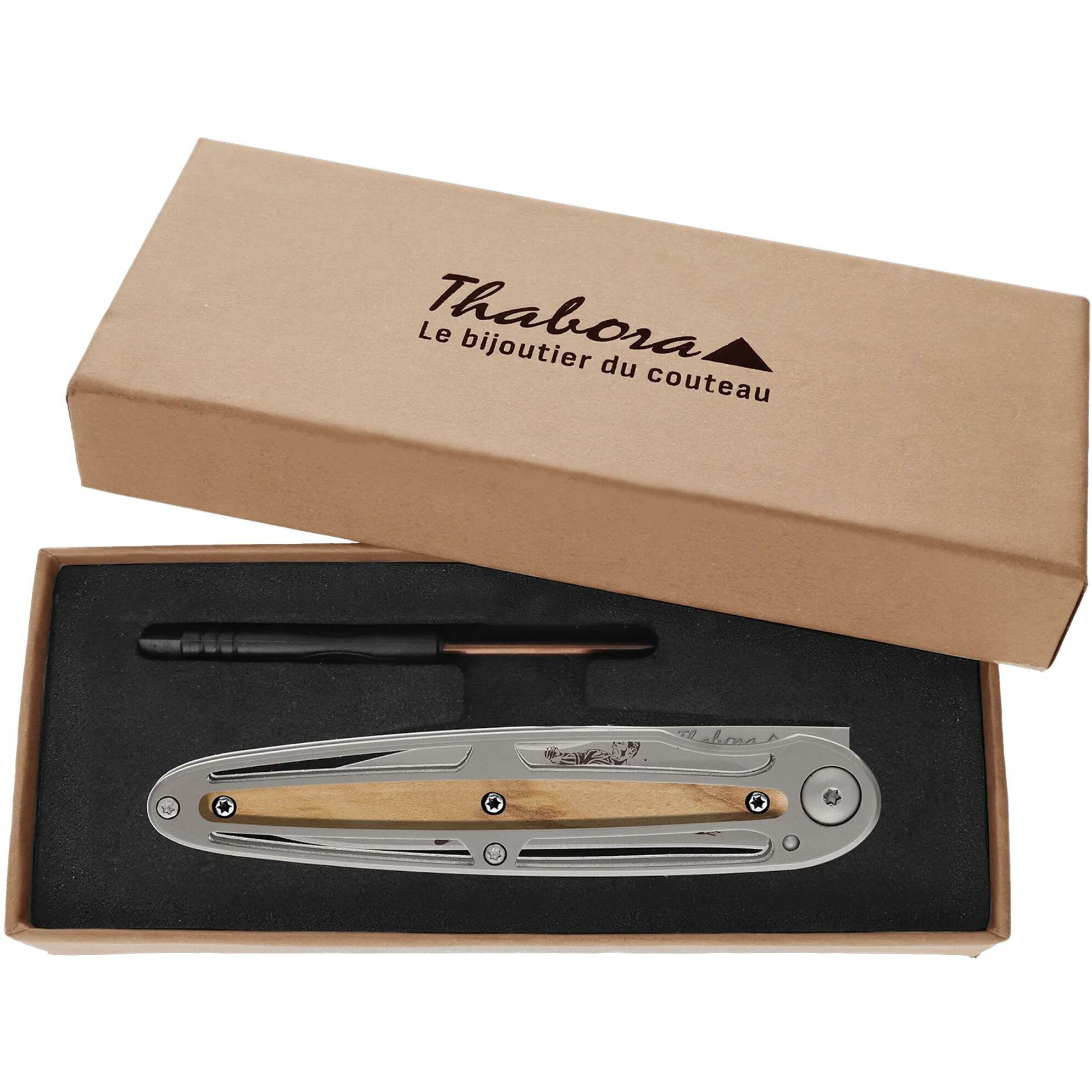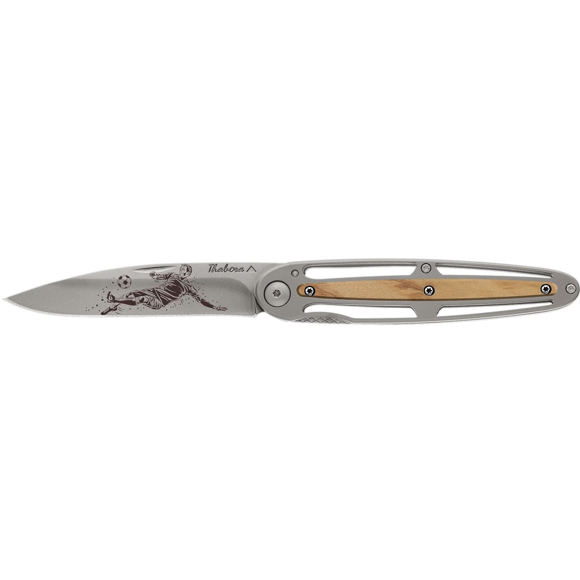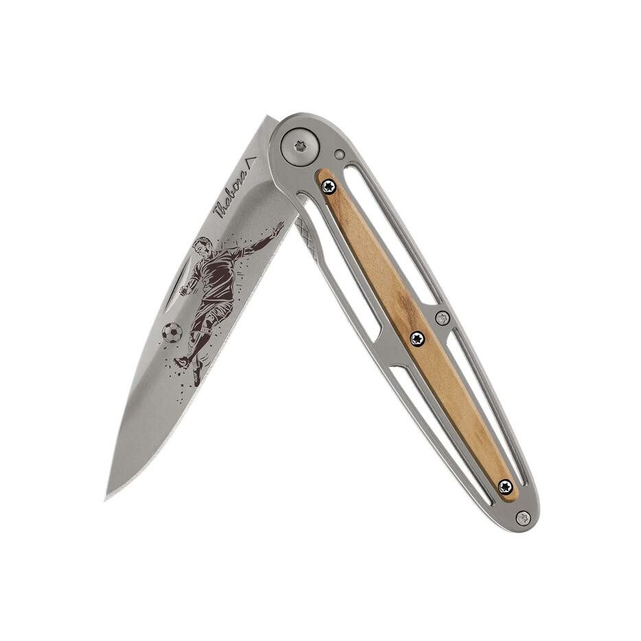 Couteau acier finition titane gris plaquette centrale bois clair motif «footballeur»