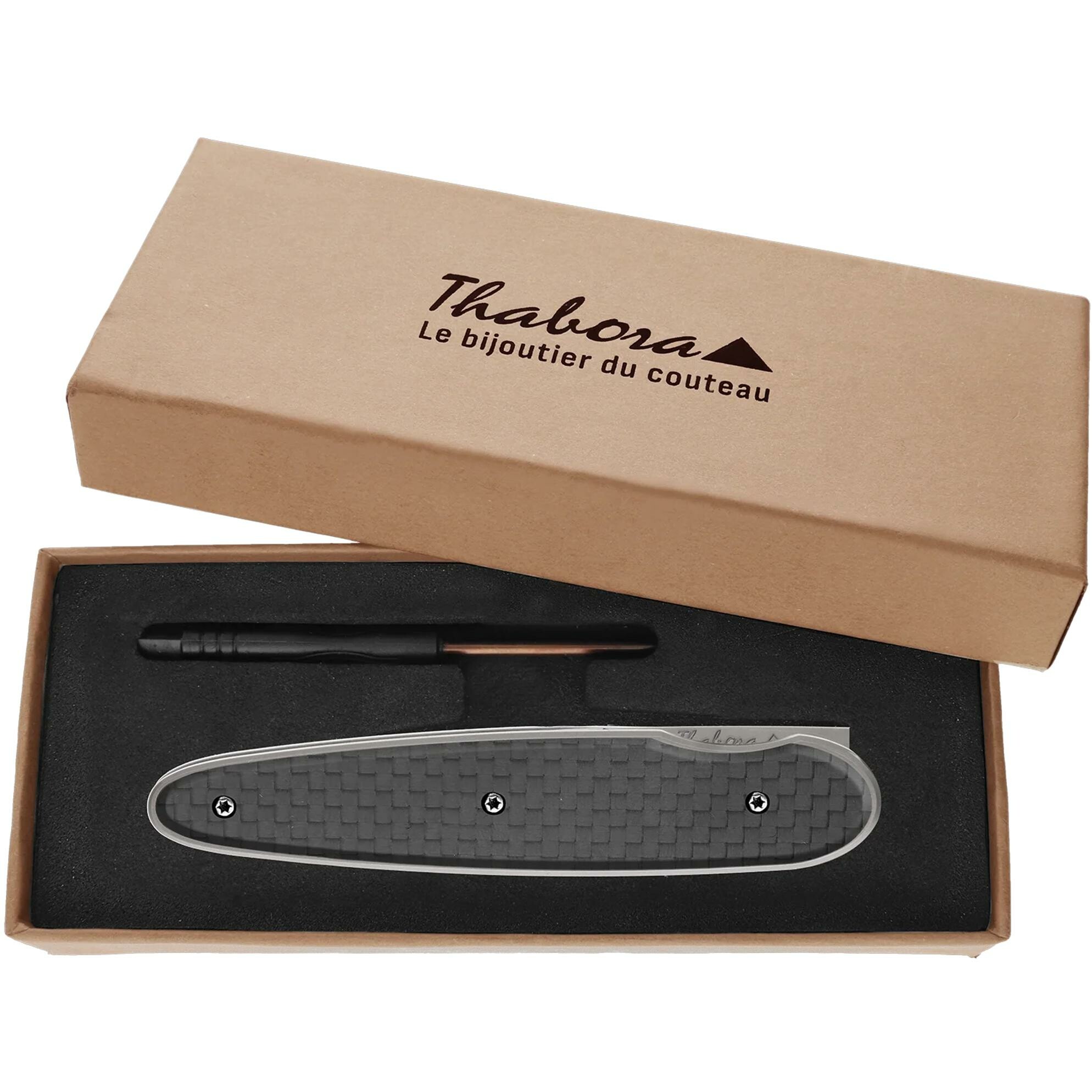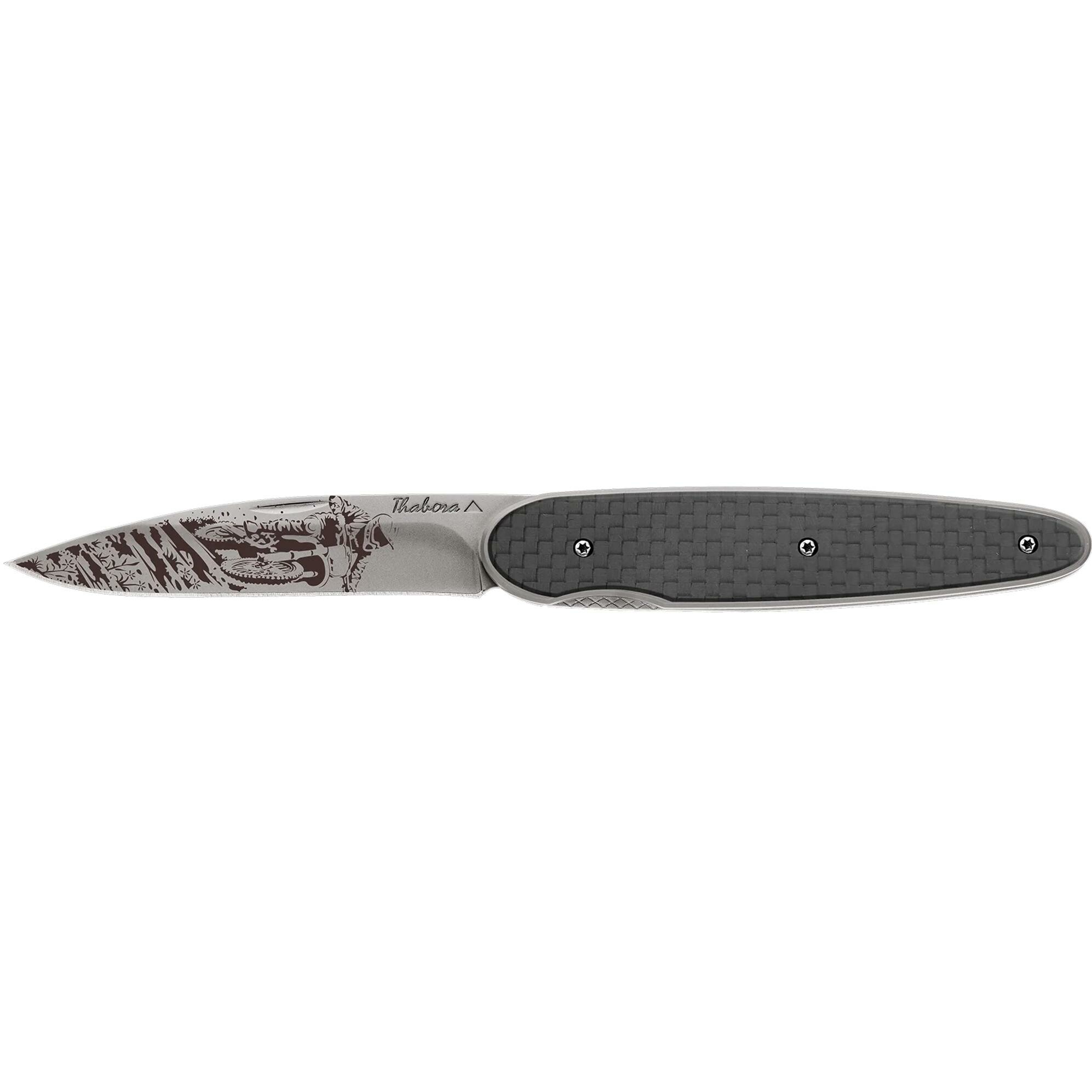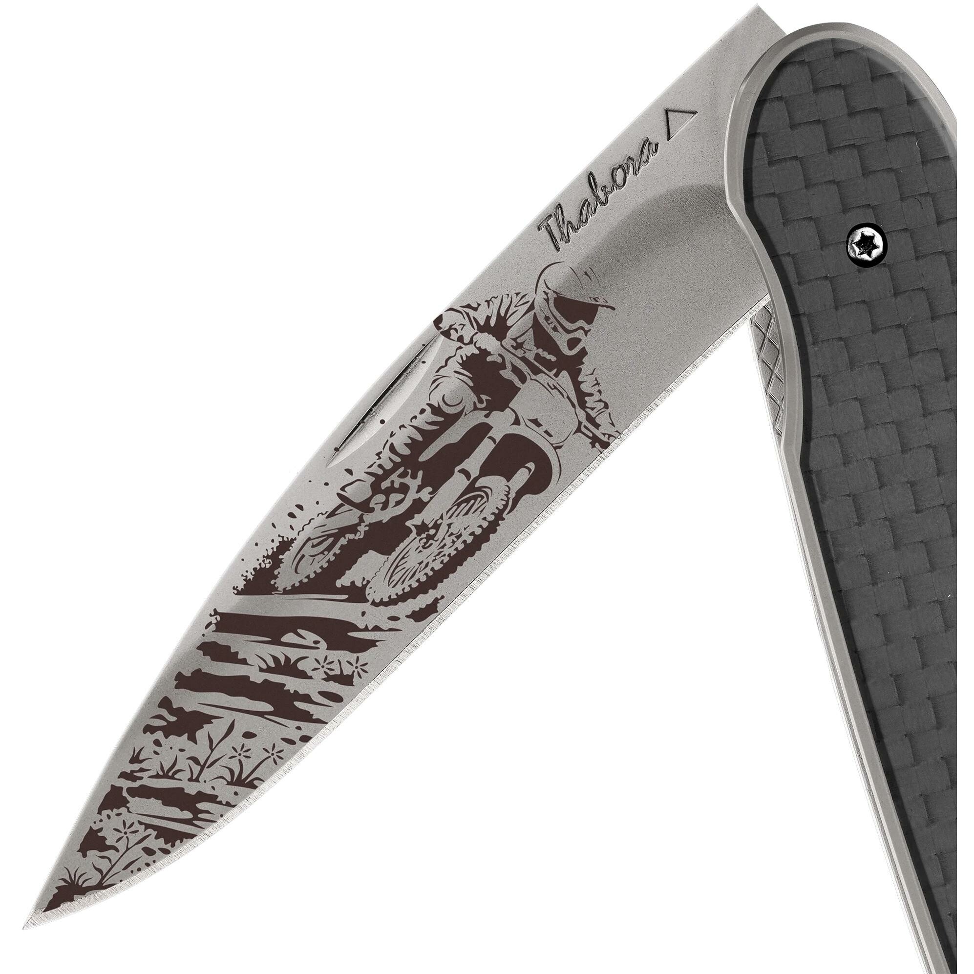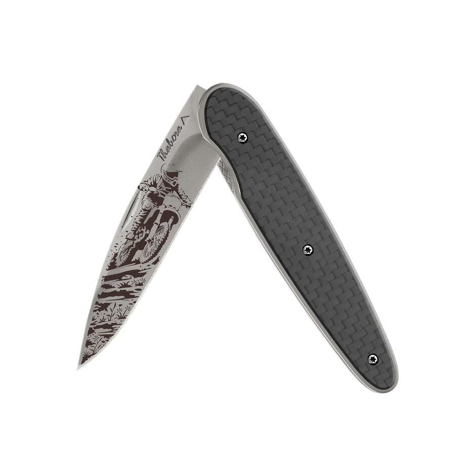 Couteau acier finition titane gris plaquette pleine carbone motif «motocross»